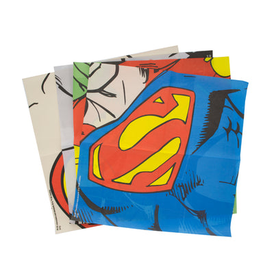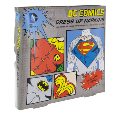 Diese Papierservietten sind die Rettung für vier wohlbekannte Helden, die in der Regel so viel um die Ohren haben, dass sie unterwegs nur eben schnell einen Hotdog mitnehmen und damit in der Hand schon gleich wieder zum nächsten Katastropheneinsatz fliegen müssen. Wer wie Superman schon einmal versucht hat, im Flug bei rasanter Geschwindigkeit einen Döner zu essen, der wird sich die Bunten Flecken auf dem Outfit bildlich vorstellen können: scharfe Soße auf dem Logo, Knoblauchsoße über dem Waschbrettbauch verteilt. Und so wie Batman im Batmobil durch Gotham City düst, hat Robin auf dem Beifahrersitz schnell mal die Pommes rot-weiß auf der Brust kleben.