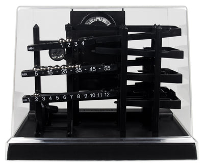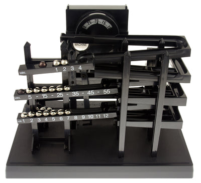 De Tijdmachine toont de tijd door de positie van in totaal 26 knikkers op 3 verschillende hellingen.