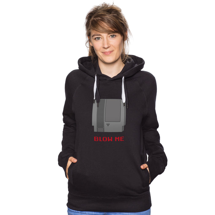 In het midden van het shirt staat een videogamecassette uit een vervlogen tijdperk met de slogan"Blow me". Dit kan gezien worden als een zinspeling op de urban legend dat blazen in de cassette kan helpen bij kinderziektes - of als een verzoek om de persoon in het shirt met rust te laten. Want "Blow me" is het Amerikaanse equivalent van het Duitse"Leck mich!". Niet leuk, maar wel efficiënt ;)