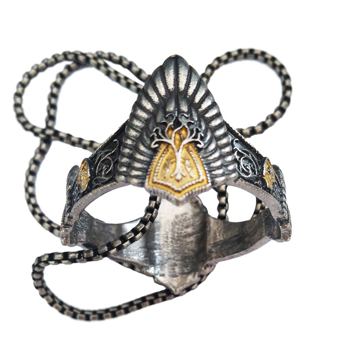 Erweise König Elessar die Ehre und trage auch du das Symbol seiner wohlverdienten Herrschaft und des Siegs über Sauron als Der Herr der Ringe Limited Edition Halskette Die Krone von Elessar immer bei dir! Diese mit vielen feinen Details verzierte Miniatur der Krone ist handlicher, leichter (und ein wenig günstiger) als das Original aus Die Rückkehr des Königs. Sie ist an einer Kette befestigt, du kannst sie also um den Hals tragen. Bei diesen besonderen Sammlerstücken handelt es sich um eine limitierte Edition – weltweit gibt es nur 5.000 Stück!