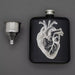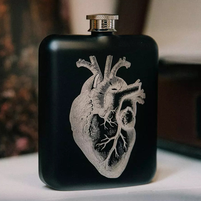 De zwartstalen heupfles is perfect voor het vervoeren van een goede druppel en kan worden afgesloten met een schroefdop. De voorkant is versierd met een lasergravure met een zeer gedetailleerd anatomisch hart.
