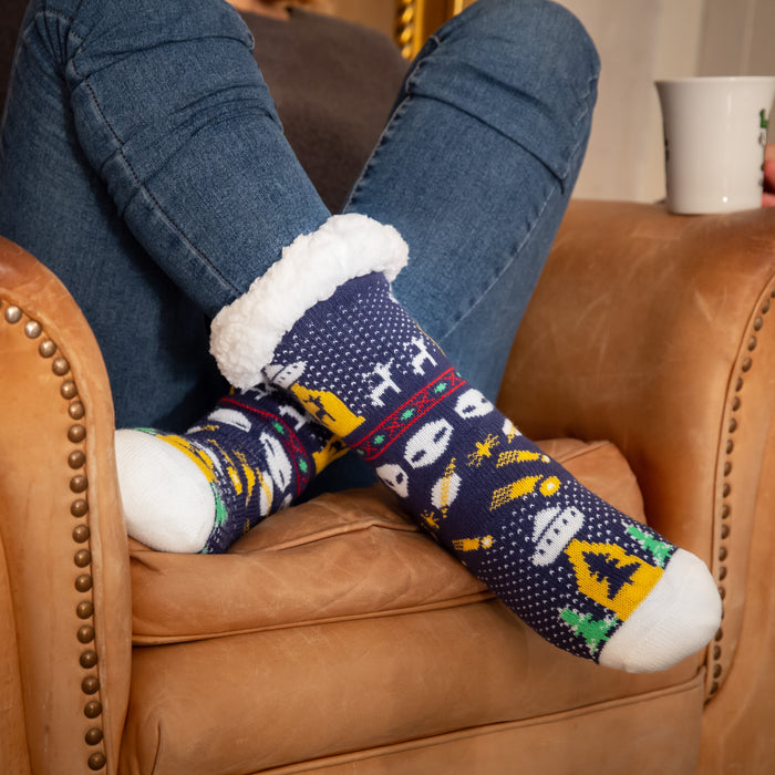 Wenn Du diese Wahrheit (!) akzeptierst, bist Du bereit für die Alien-Wintersocken von getDigital! Dieses Paar herrlich flauschiger Socken zeigt unsere außerirdischen Freunde und ihre fliegenden Untertassen dabei, wie sie Rentiere und Tannenbäume entführen. Natürlich nur für streng wissenschaftliche „Experimente“… Der obere Teil der Socken verfügt über einen extra-flauschigen Saum, sodass Du die Socken nie wieder ausziehen wollen wirst! Die Socken sind in einer Einheitsgröße verfügbar, die bis zu einer Schuhgröße von 46 EU passt.