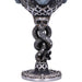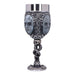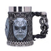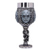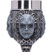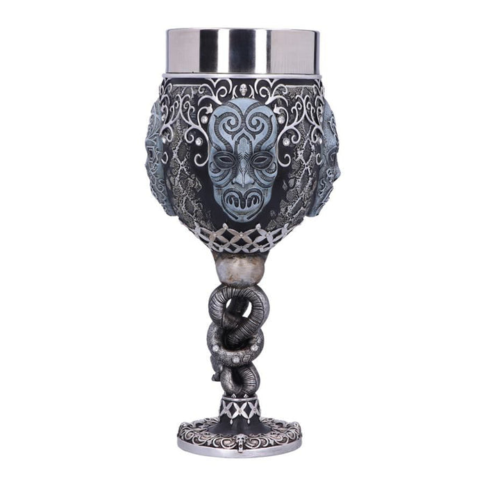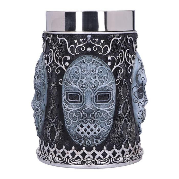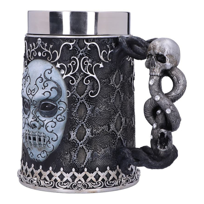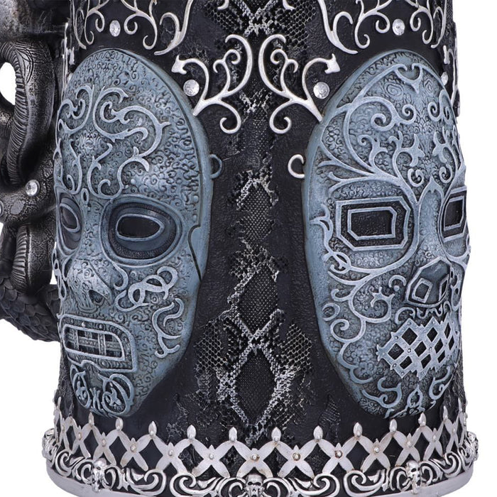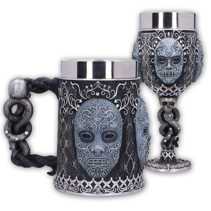 Maak indruk op de Duistere Heer op de volgende bijeenkomst met je stijlvolle handgeschilderde bierpul of wijnbeker met het karakteristieke Dooddoenersmasker uit de Harry Potter films. Beide vaten zijn versierd met een aantal andere symbolen uit de duistere wereld van de Dooddoeners: De steel van de wijnbeker en het handvat van de bierpul zijn beide gemodelleerd naar het Duistere Teken, en beide vaten zijn helemaal versierd met kleine schedels, slangenhuidpatronen en soortgelijke accenten. Het roestvrijstalen inzetstuk kan worden verwijderd om schoon te maken.