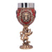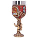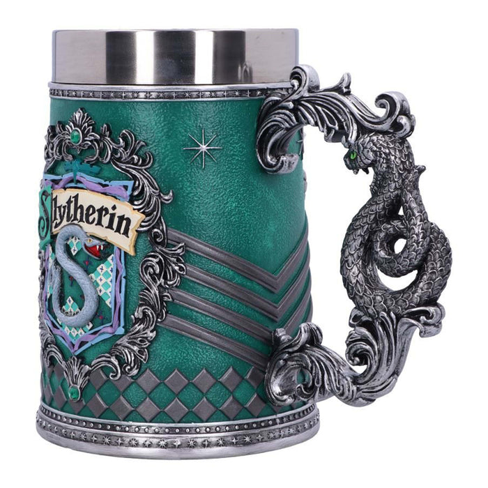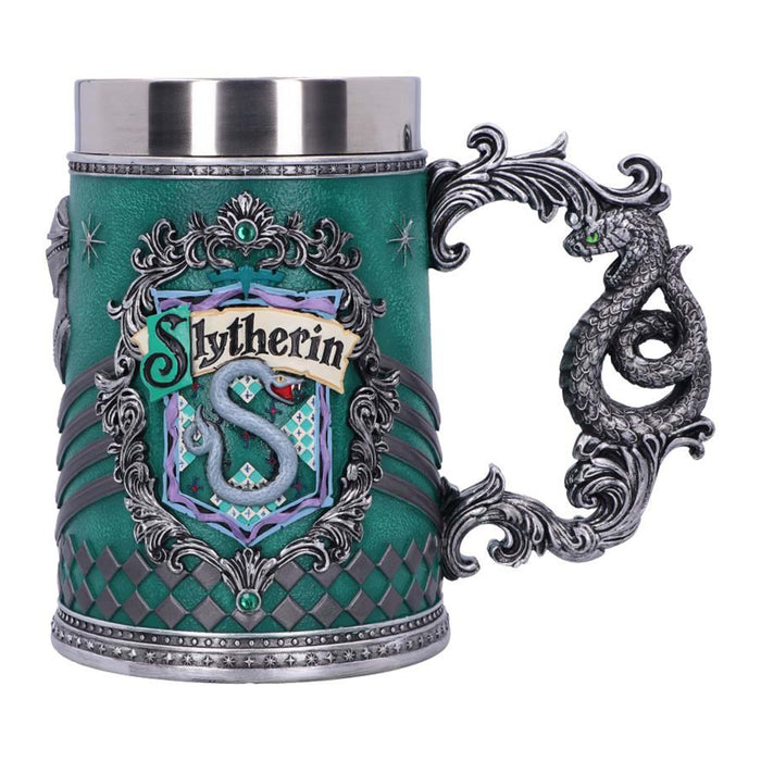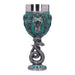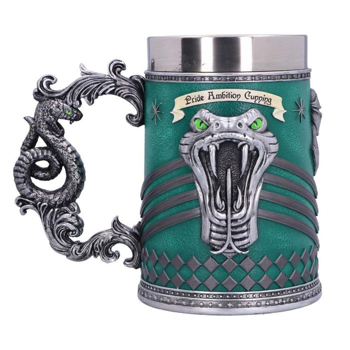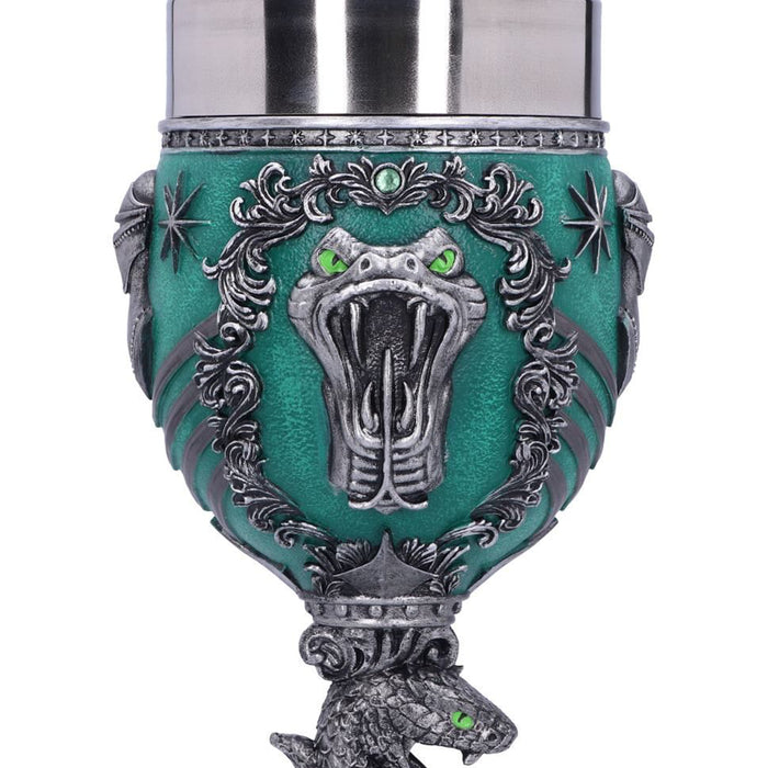 • De groene Slytherin wijnbeker is voorzien van het huiswapen en een gedetailleerde afbeelding van een slang. De steel van de beker is ook gemodelleerd naar een slang en de beker is rijkelijk versierd met kleine details zoals sterren, een groene steen en andere details.