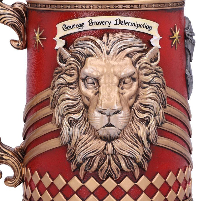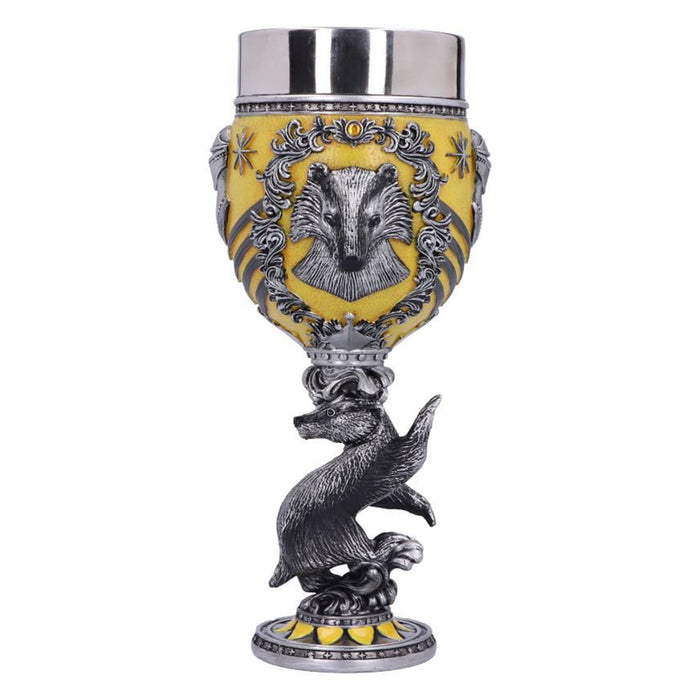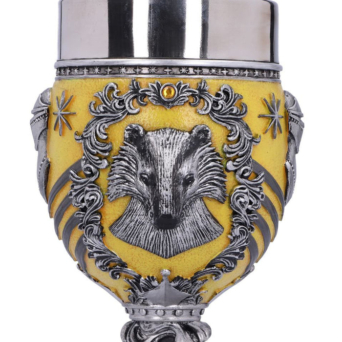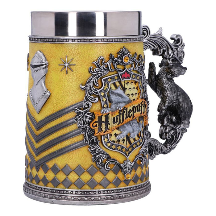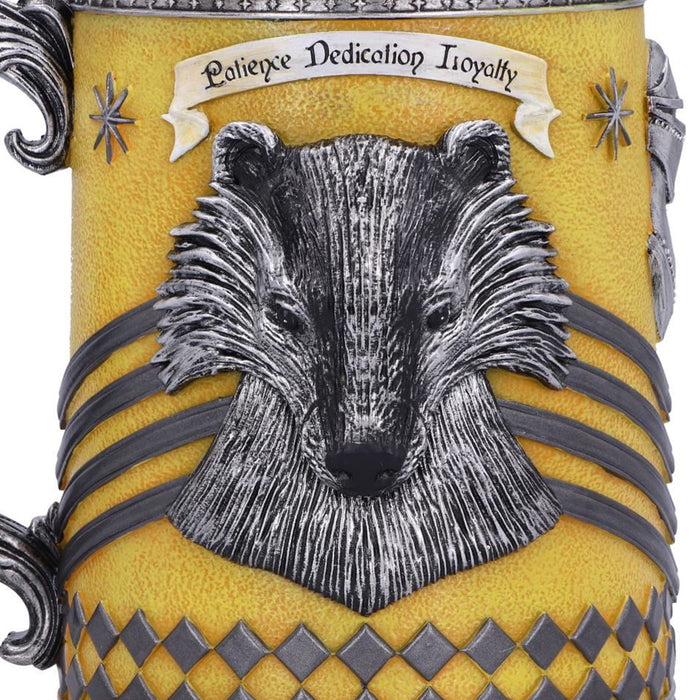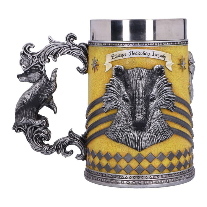 • De Hufflepuff bierpul is geel van kleur. Het handvat van de drinkbeker is gemodelleerd naar het heraldische dier van de Hufflepuffs, de das. Het huiswapen zelf en een andere das zijn te zien op de mok, die rijkelijk versierd is met sterren, een gele steen en andere details. Op de bierpul staan ook de 3 belangrijkste kenmerken of waarden van de Hufflepuffs.