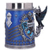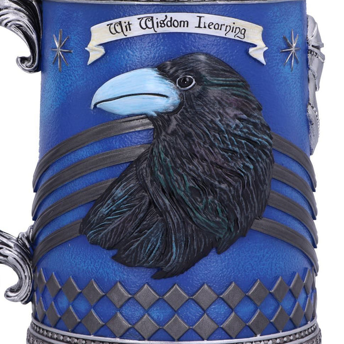 • De Ravenclaw bierpul en wijnbokaal dragen de Ravenclaw huiskleur blauw. Op de beker en de wijnvaat staan het huiswapen en het heraldische dier uit de films, de raaf. Het handvat of de steel is ook gemodelleerd naar een raaf. Beide vaten zijn versierd met sterren, blauwe steentjes en andere details. Op de bierpul zijn ook de 3 belangrijkste kenmerken en waarden van de Ravenklauwen afgebeeld.