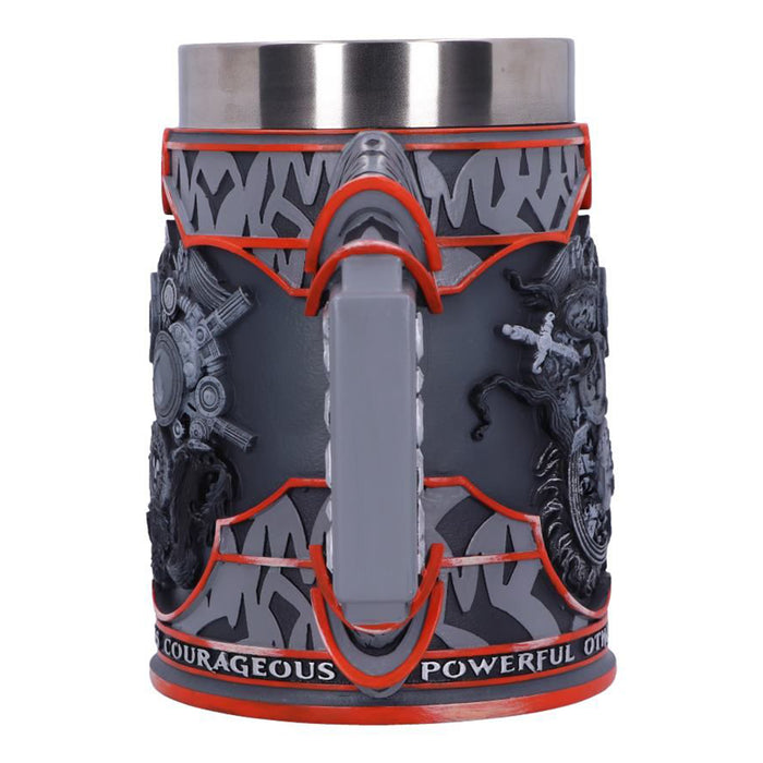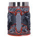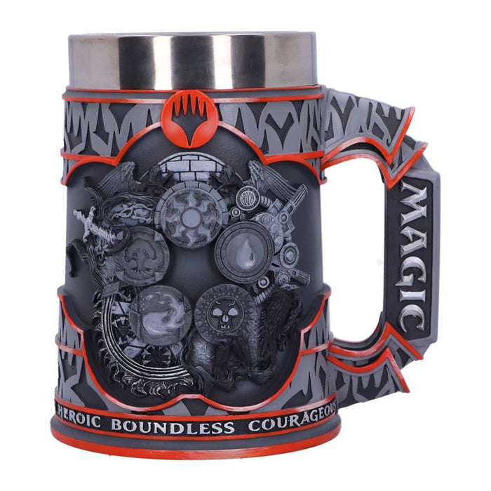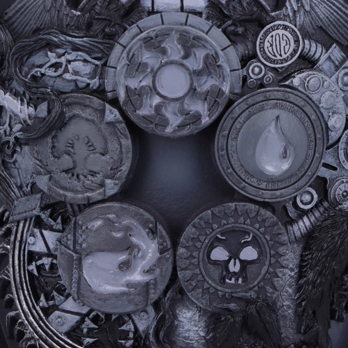 Met alle stress van een Magic duel is het altijd goed om iets te drinken bij de hand te hebben - in de bijpassende Magic the Gathering bierpul natuurlijk. De officieel gelicenseerde, handgeschilderde mok is helemaal versierd met elementen uit het kaartspel. Het meest in het oog springend is natuurlijk het Magic logo op het handvat, en als je twee keer kijkt, herken je ook het Planeswalker symbool aan de bovenkant van de pul. In het midden van de kan staan de vijf manasymbolen, die staan voor bepaalde kleuren of landen: Blauw (eiland), Groen (bos), Zwart (moeras), Rood (bergen) en Wit (vlaktes). Elk van de ronde symbolen heeft kleine maar uiterst precieze details die de filosofieën en magische eigenschappen van de kleuren vertegenwoordigen - bijvoorbeeld kraaien en corruptie voor zwart en vuur en technologie voor rood. Onderaan de pul staan Engelse bijvoeglijke naamwoorden die herinneren aan de idealen en waarden van de Planeswalkers.