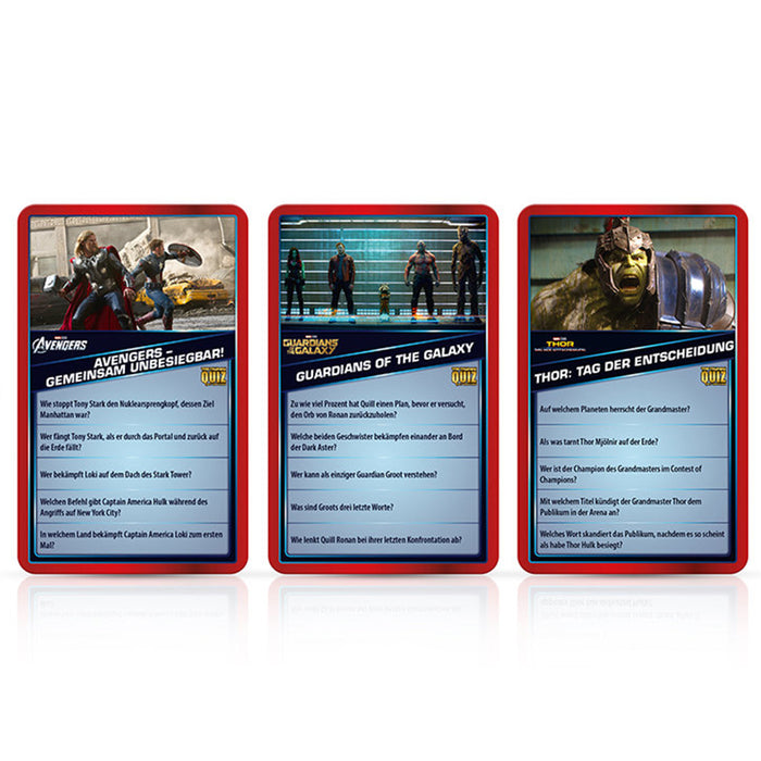 In deze quiz wordt je MCU-kennis op de proef gesteld aan de hand van in totaal 100 speelkaarten met elk 5 vragen: Op welke planeet regeert de Grandmaster? Welke bezienswaardigheid in New York City is de ontmoetingsplaats van Captain America en Nick Fury? Waar is Scott Lang als hij het Ant-Man pak voor het eerst activeert? Als je denkt dat je de antwoorden op deze vragen weet, is het tijd om het op te nemen tegen je vrienden en familie: Vorm een team met minstens één andere persoon van 12 jaar of ouder en versla je tegenstanders* met je fan-kennis! Natuurlijk kun je het ook in teams tegen elkaar opnemen. En in het praktische doosje kun je de kaarten gemakkelijk meenemen, zodat je ook onderweg kunt spelen.