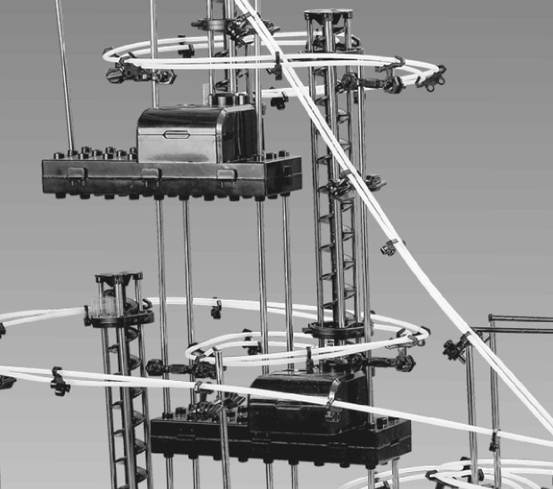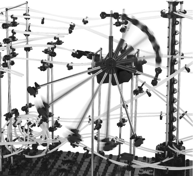 De knikkerachtbaan is een uitdaging voor elke knikkerbaanbouwer en, als hij eenmaal draait, nog meer voor de knikker! Want die rolt niet gewoon van boven naar beneden. Nee, hij gaat door schakelaars en verandert zo steeds weer van pad, moet meerdere loopings, wippen, snelle afdalingen en krappe bochten doorstaan - om uiteindelijk in een lift terecht te komen die hem vanzelf weer naar boven transporteert. Vanaf daar begint hun rit vol actie weer van voren af aan.