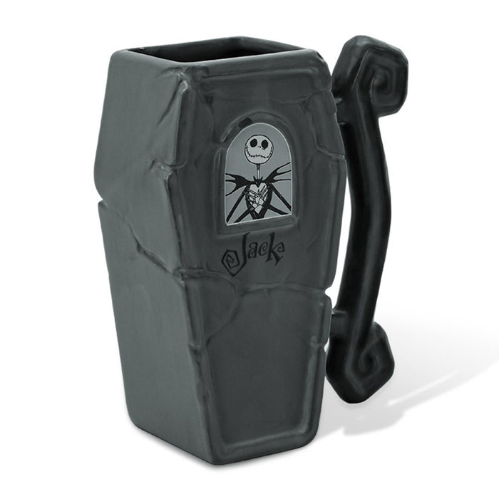 De Nightmare Before Christmas 3D mokkenkist ziet eruit alsof hij rechtstreeks uit een keuken in Halloween Town komt: de donkere kleuren, vreemde vorm en het morbide motief zijn daar heel normaal. Maar hier is de grijze mok in de vorm van een doodskist een echte curiositeit. Het hoogtepunt is natuurlijk de afbeelding van Jack die als uit een raam uit de bovenkant van de kist kijkt en zijn naam eronder.
