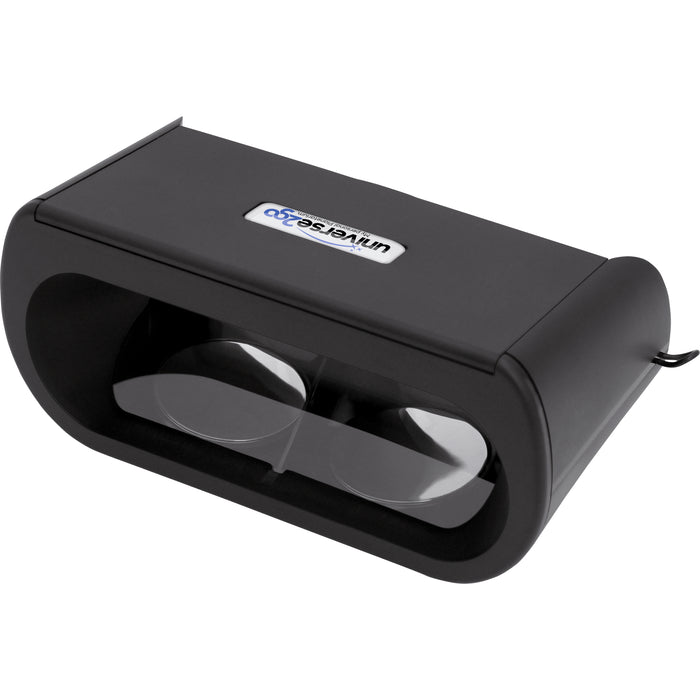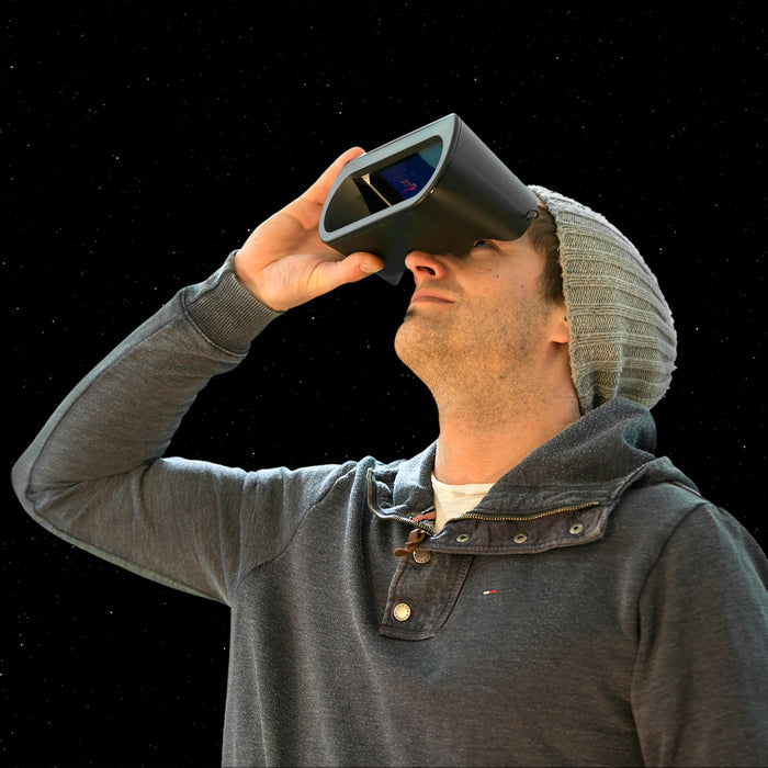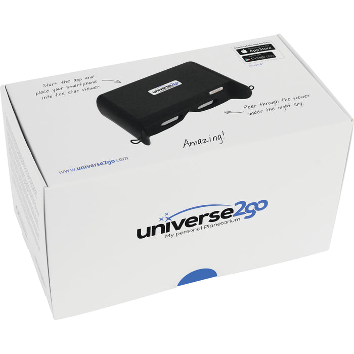 Het universe2go planetarium voor smartphones combineert het beste van twee werelden: een blik op de nachtelijke hemel en de projectie van interessante informatie in het gezichtsveld. En het is ook nog eens heel eenvoudig te gebruiken! Het enige wat je hoeft te doen is een geschikte smartphone (zie technische details hieronder) in de behuizing van de universe2go bril te steken, de app te starten (activeringscode meegeleverd) en naar de nachtelijke hemel te kijken. Informatie over de sterrenbeelden en andere hemellichamen wordt met behulp van spiegels direct over de echte objecten aan de hemel heen gelegd.