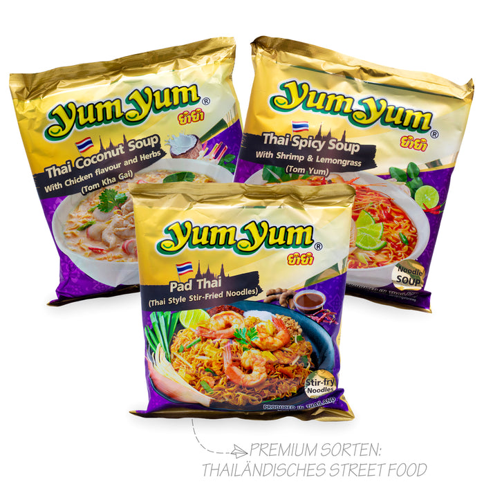 Uit een totaal van 16 Yum Yum soorten selecteren we er willekeurig tien voor jouw box. We zorgen ervoor dat je een uitgebalanceerde variatie van verschillende smaken ontvangt. Daarom krijg je zowel ramen klassiekers, zoals garnalen, kip of groenten, als populaire Thaise gerechten zoals groene curry, pad Thai of Thaise pittige soep. Er zitten drie pakken van elk van deze tien variëteiten in de doos, dus je krijgt in totaal 30 pakken instant noedels!